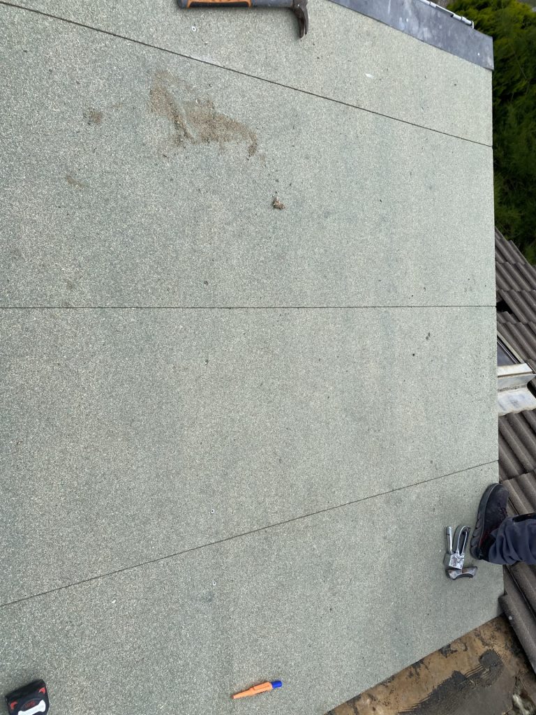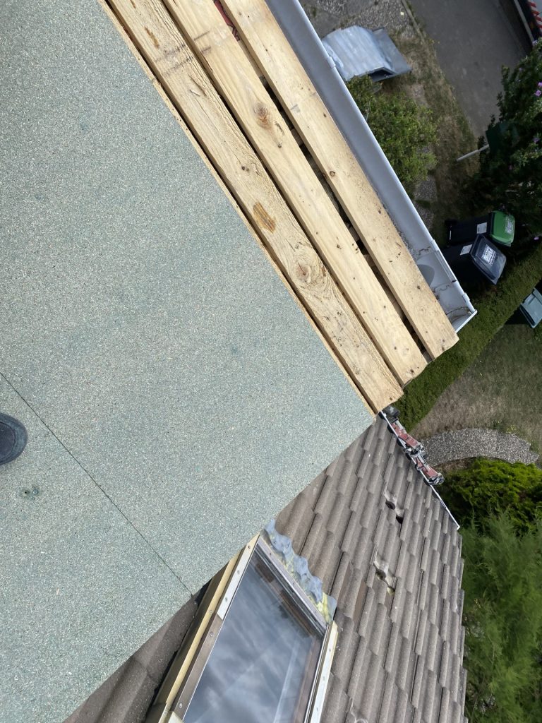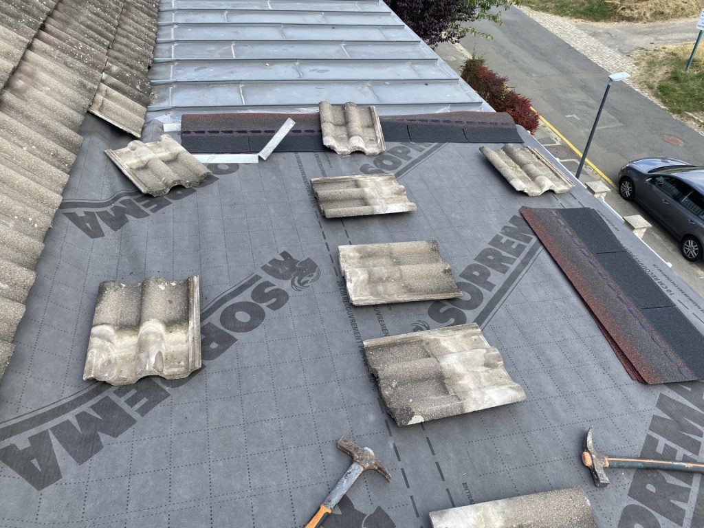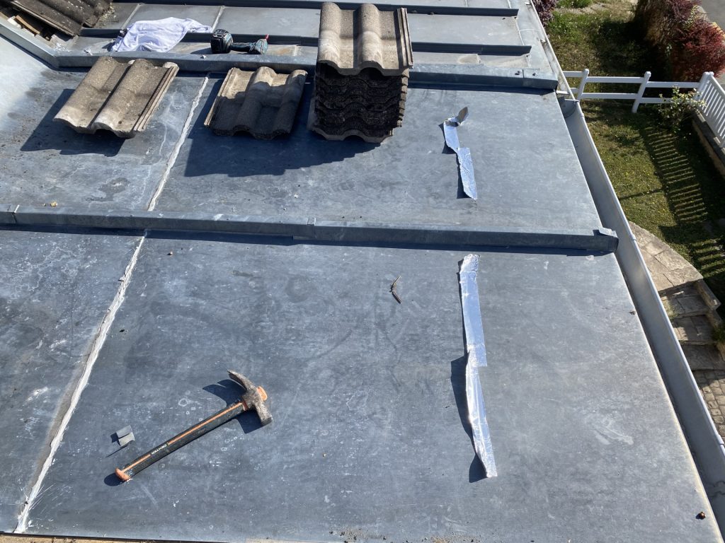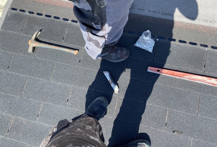 Voici l’un de nos chantiers sur la commune de Saint-Martin-du-Tertre. Nous avons déposé une toiture en zinc. Nous avons mis par la suite des planches au SB Hydrofuge et posé un écran de sous toiture. Puis, nous avons posé du shingle.
