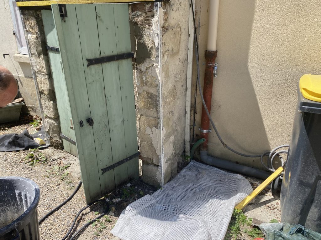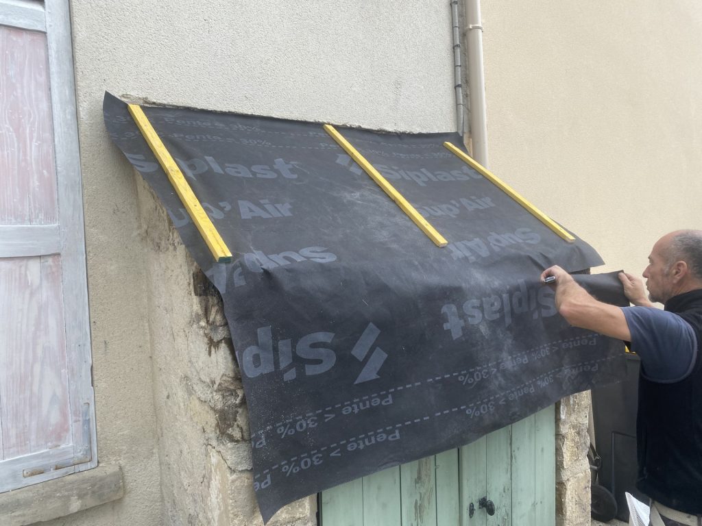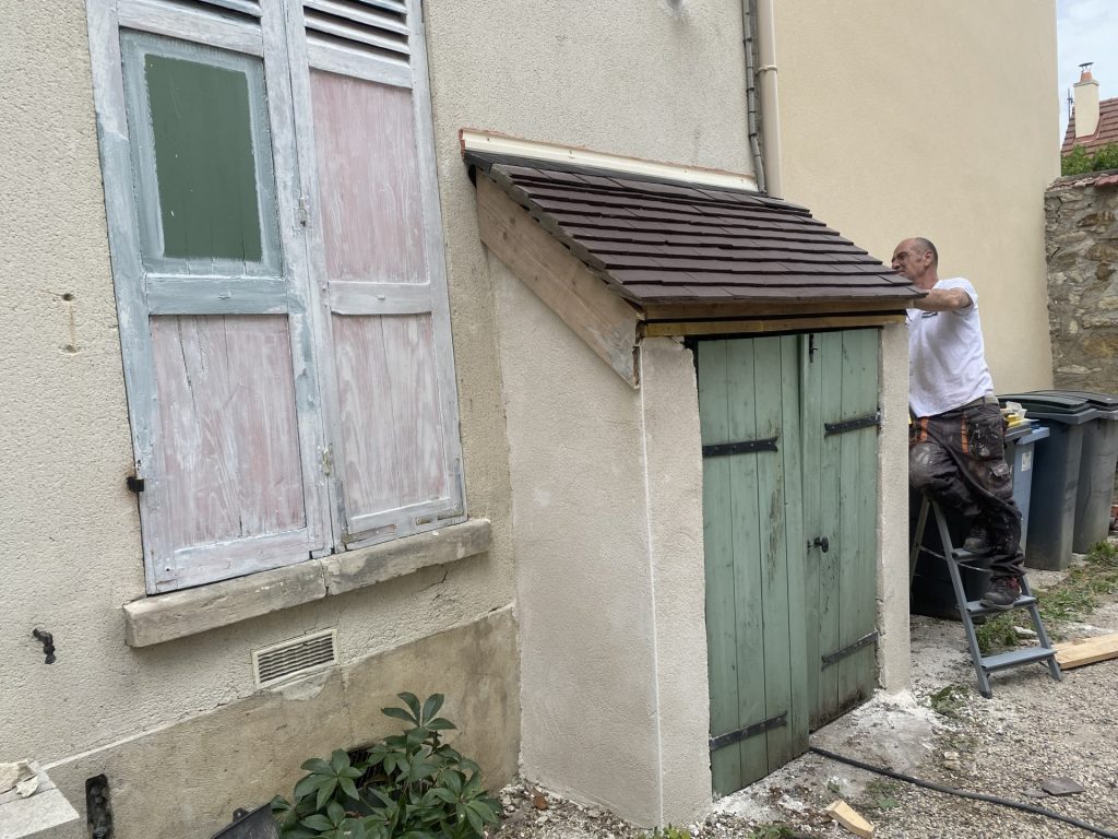 Voici la rénovation d’un sas d’entrée. Nous avons déposé toute la toiture pour remettre un nouvel écran de sous toiture, des contre lattes, des lattes et de la tuile plate. Nous avons aussi refait les murs avec un crépi blanc cassé finition grattée.